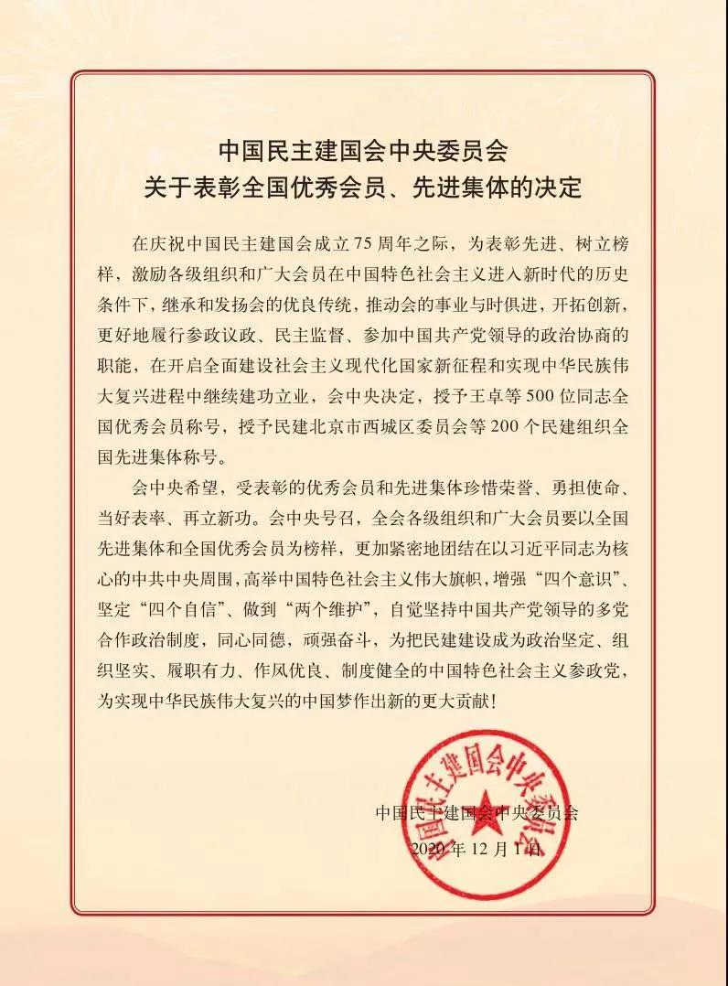 12月1日,民建成立75周年全國(guó)優(yōu)秀會(huì)員和先進(jìn)集體暨抗擊新冠肺炎疫情先進(jìn)個(gè)人和先進(jìn)集體表彰大會(huì)在北京隆重舉行。